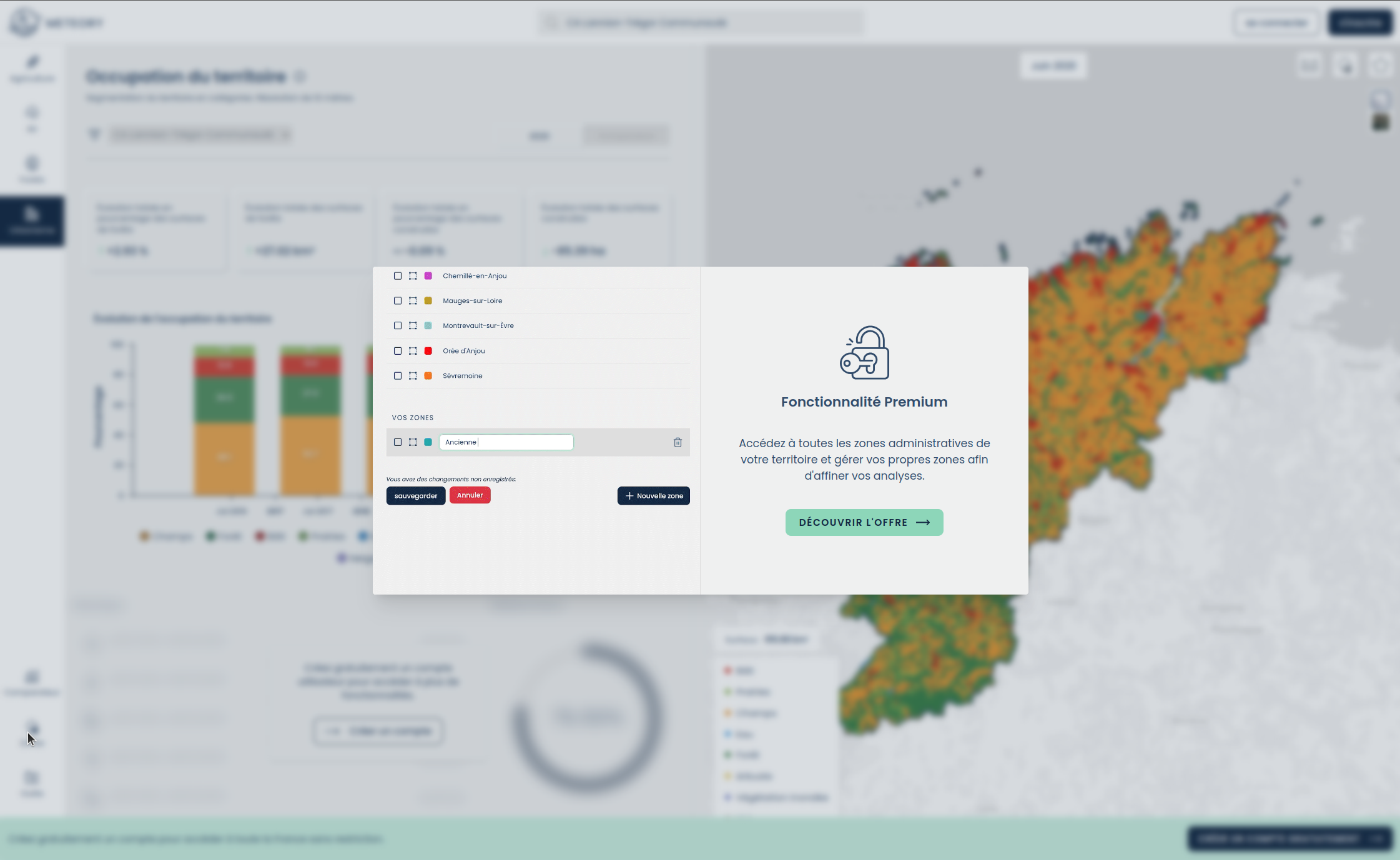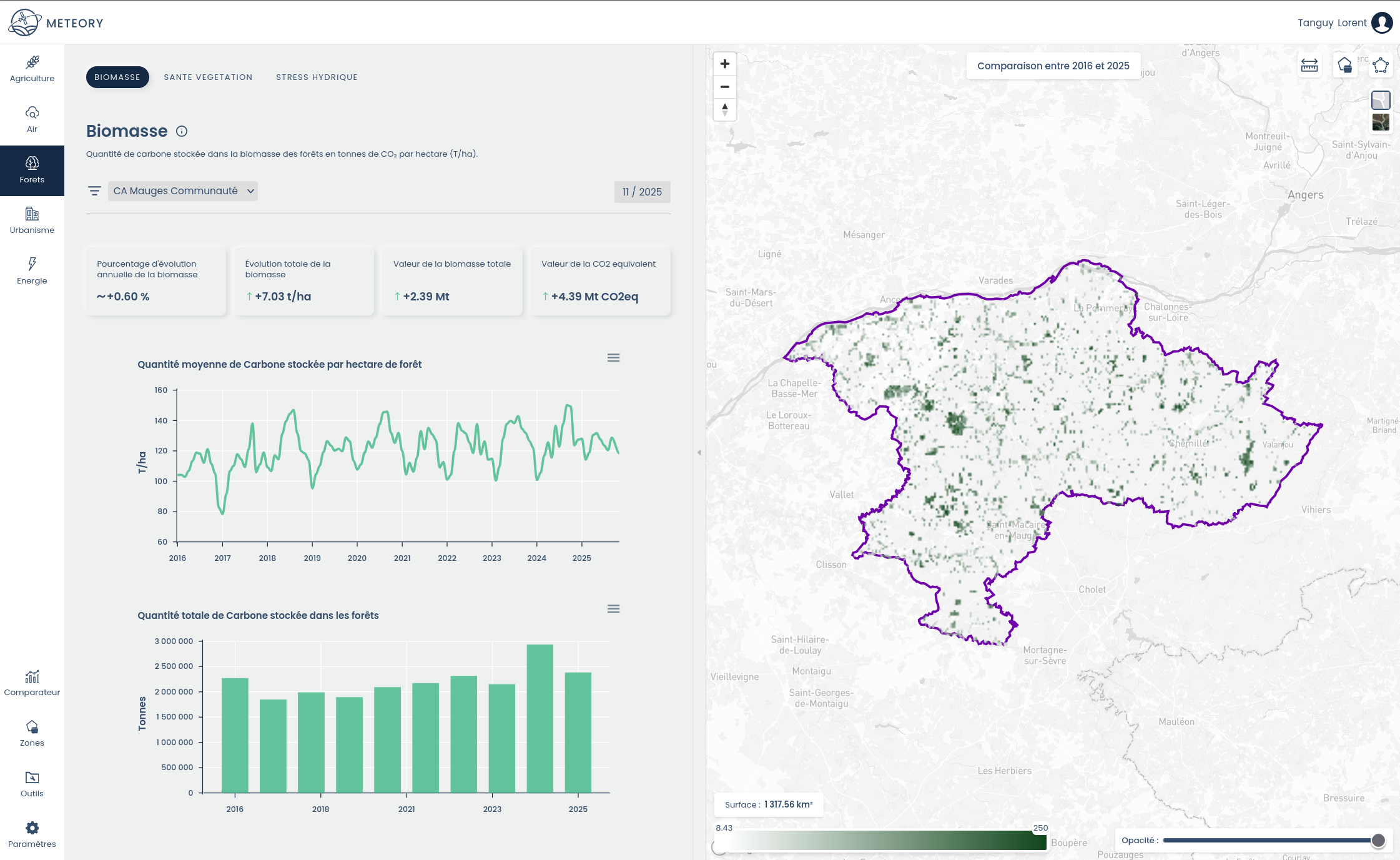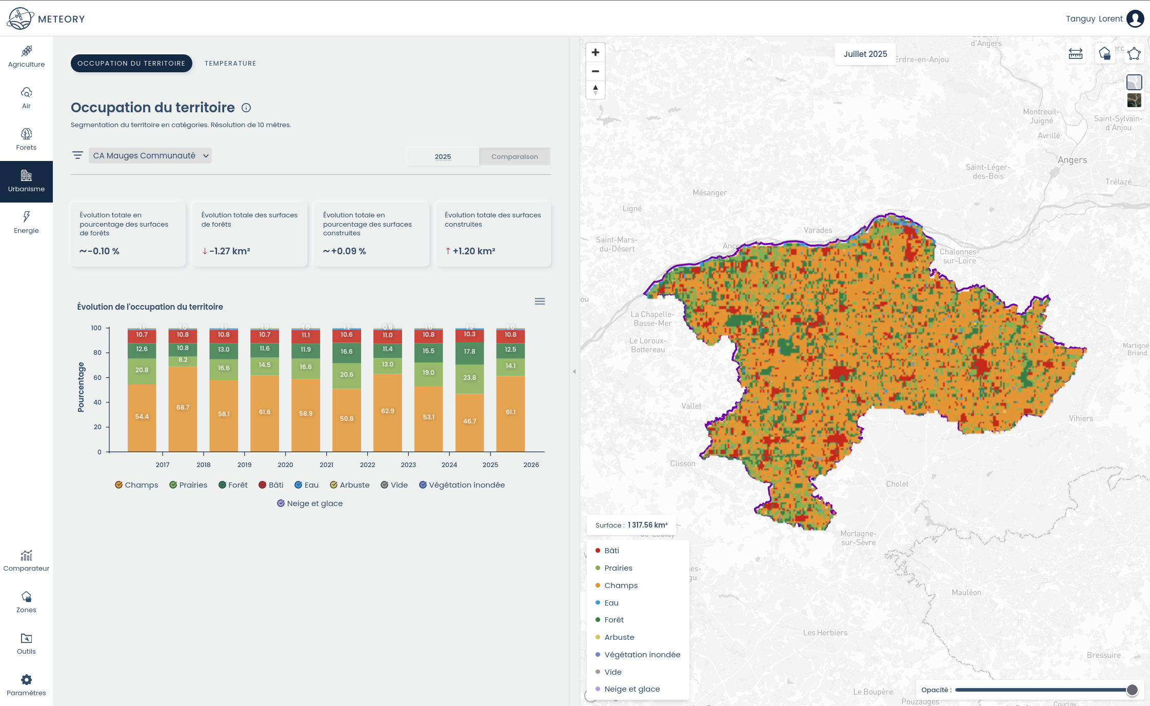 Web application permettant aux communes et EPCI clients de Meteory d'accéder à toute la donnée environnementale de leur territoire. Séquestration carbone des sols et des forêts, artificialisation des sols, consommation & Production électrique, Indice de santé de la végétation ; la plateforme regroupe tous les jeux de données nécessaires au diagnostic PCAET (Programme Communautaire d'Actions Environnementales Territoriales).
