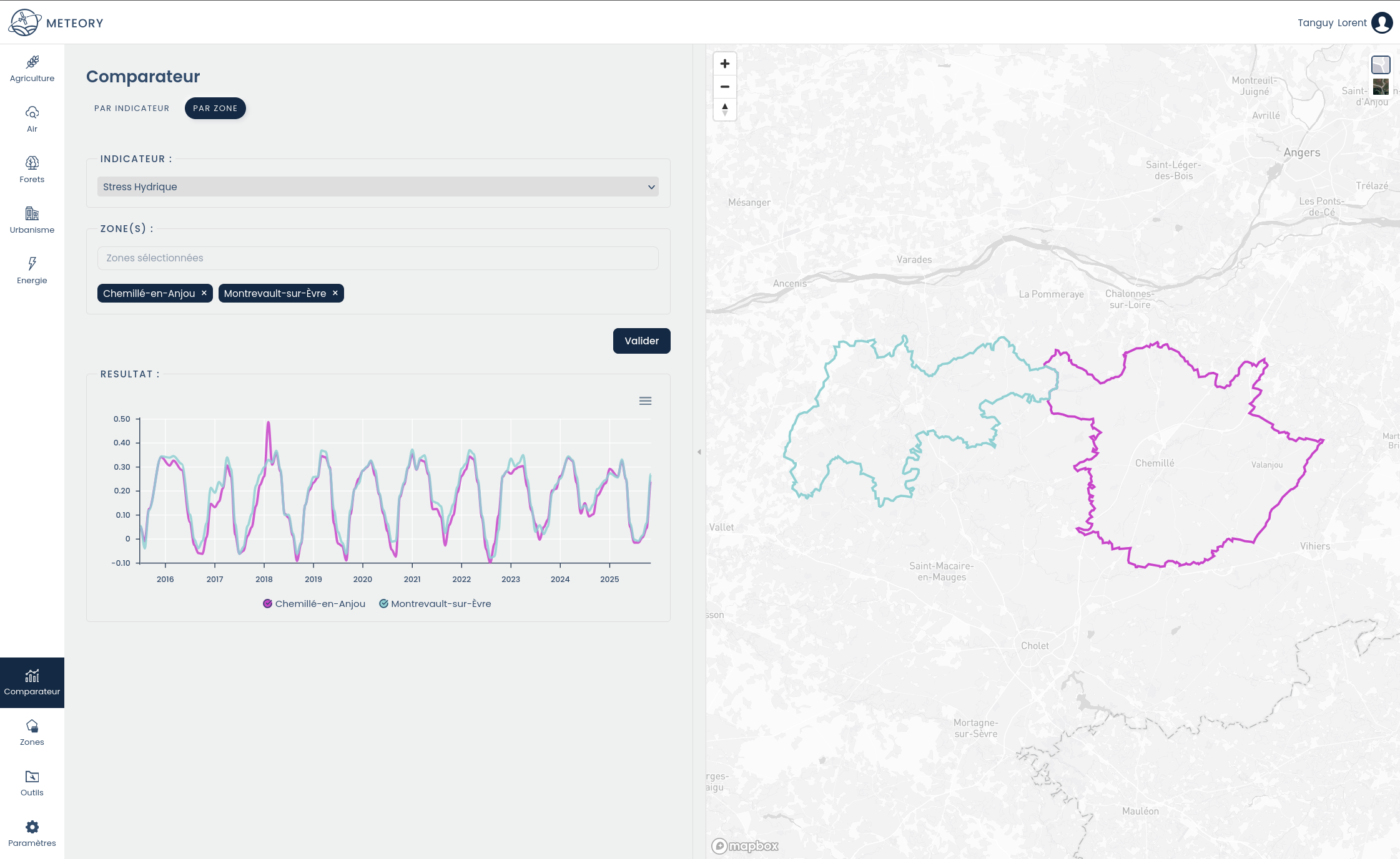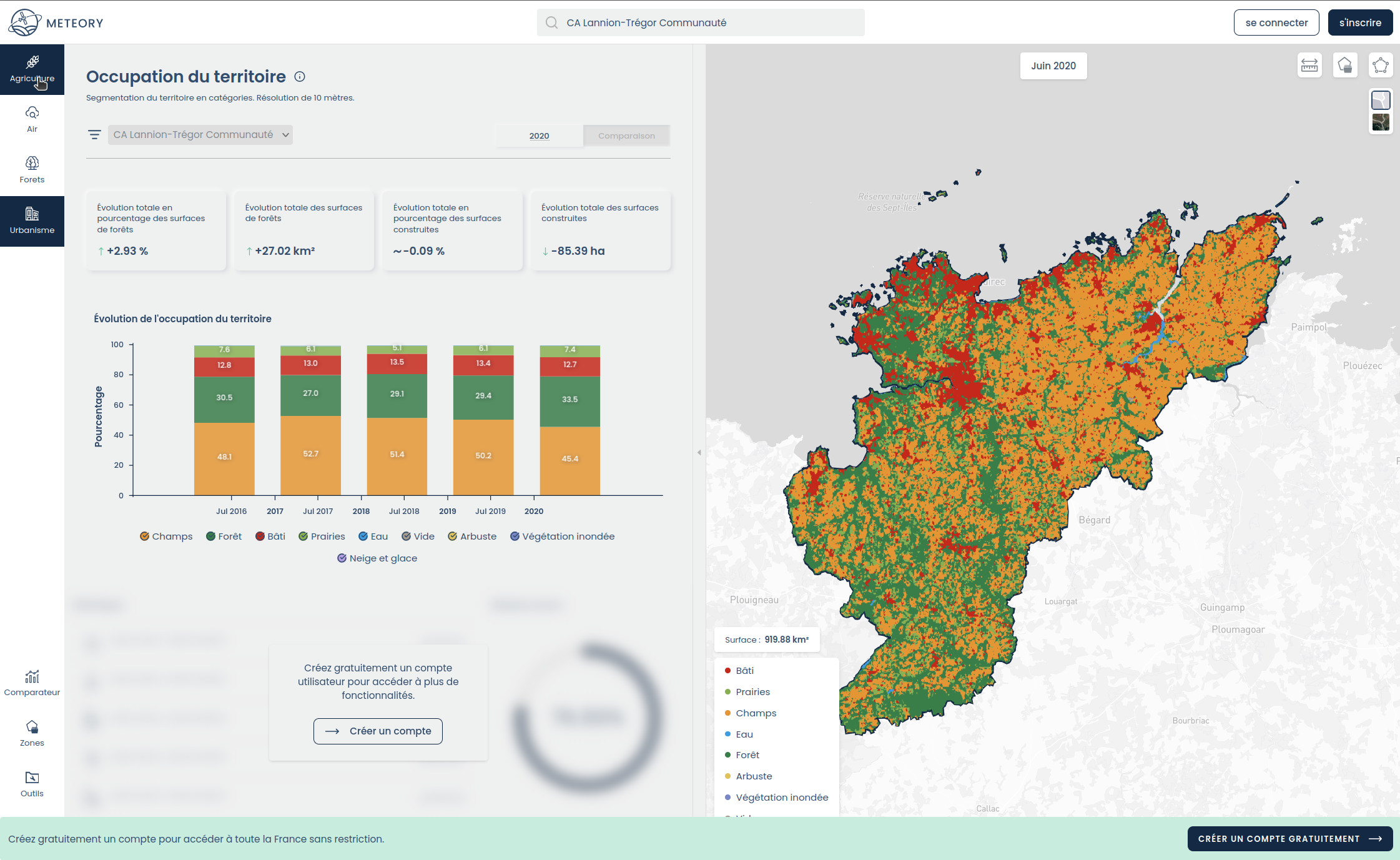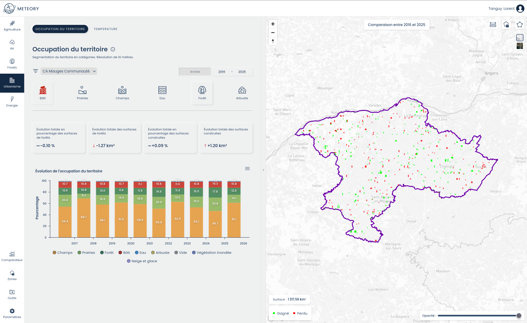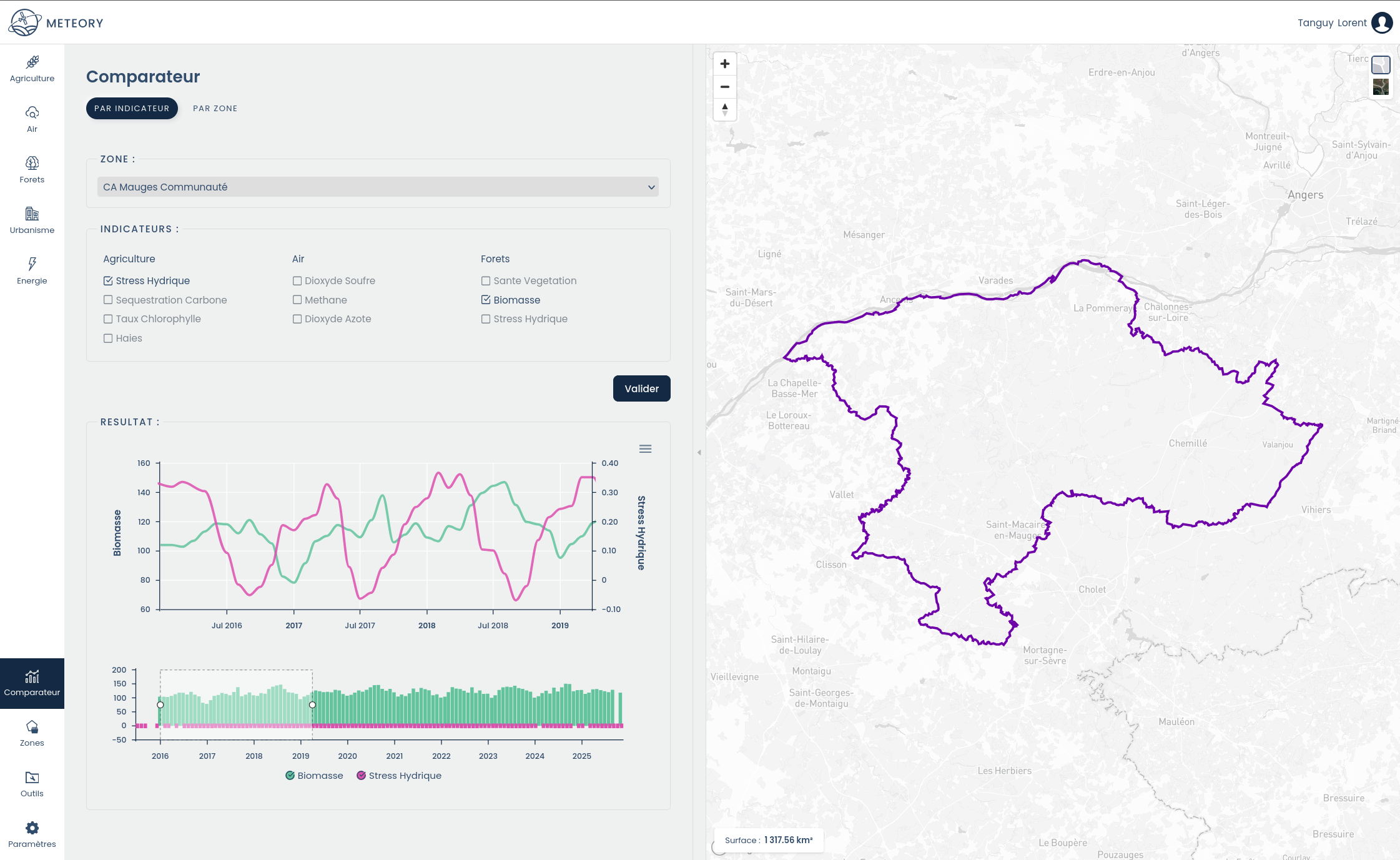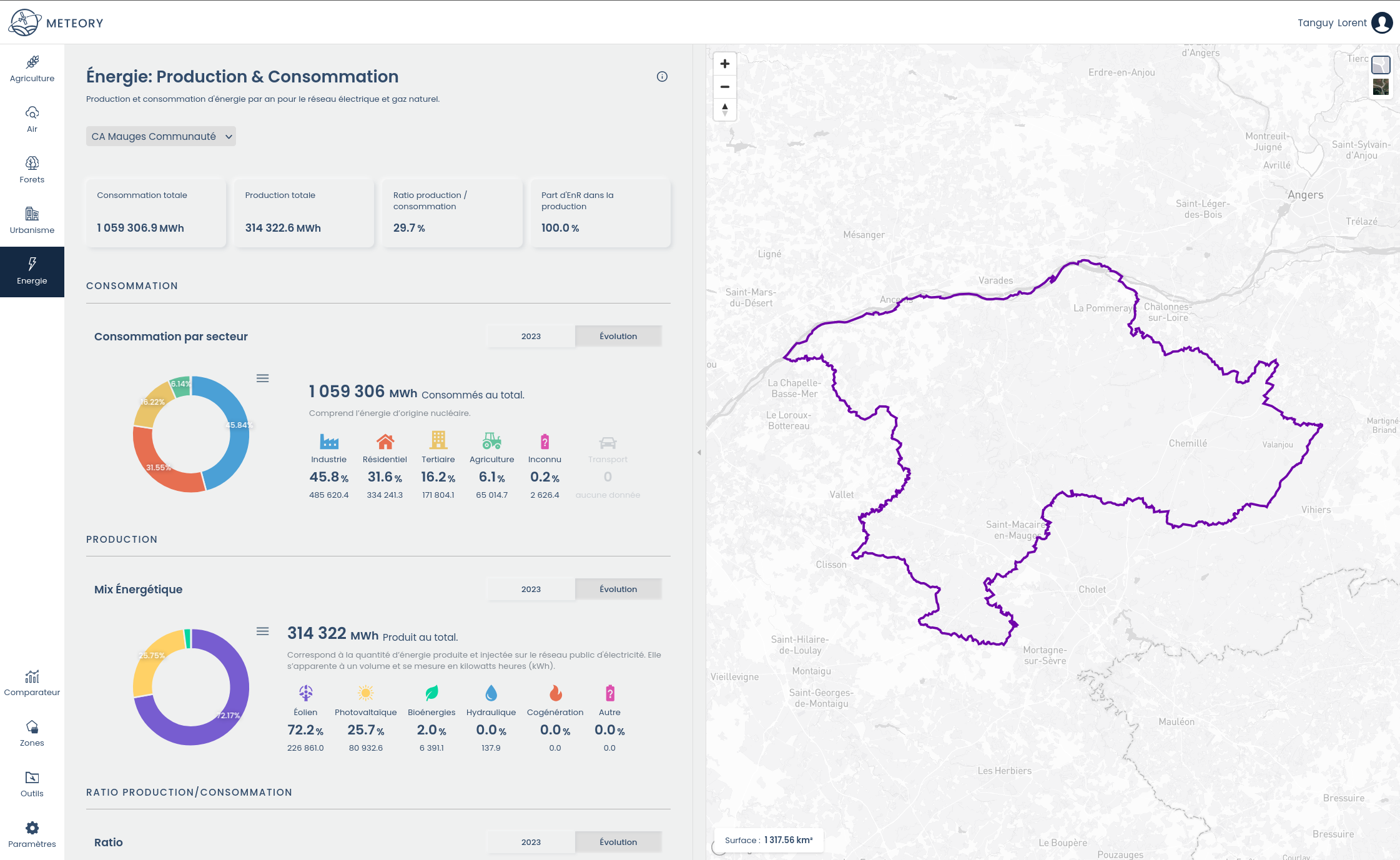 Web application permettant aux communes et EPCI clients de Meteory d'accéder à toute la donnée environnementale de leur territoire. Séquestration carbone des sols et des forêts, artificialisation des sols, consommation & Production électrique, Indice de santé de la végétation ; la plateforme regroupe tous les jeux de données nécessaires au diagnostic PCAET (Programme Communautaire d'Actions Environnementales Territoriales).