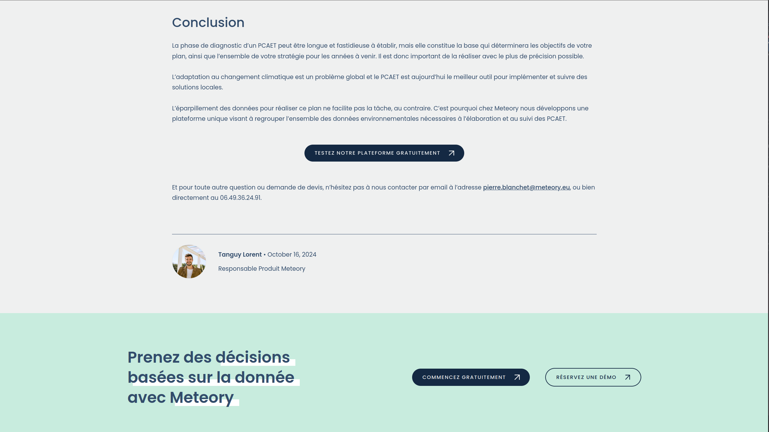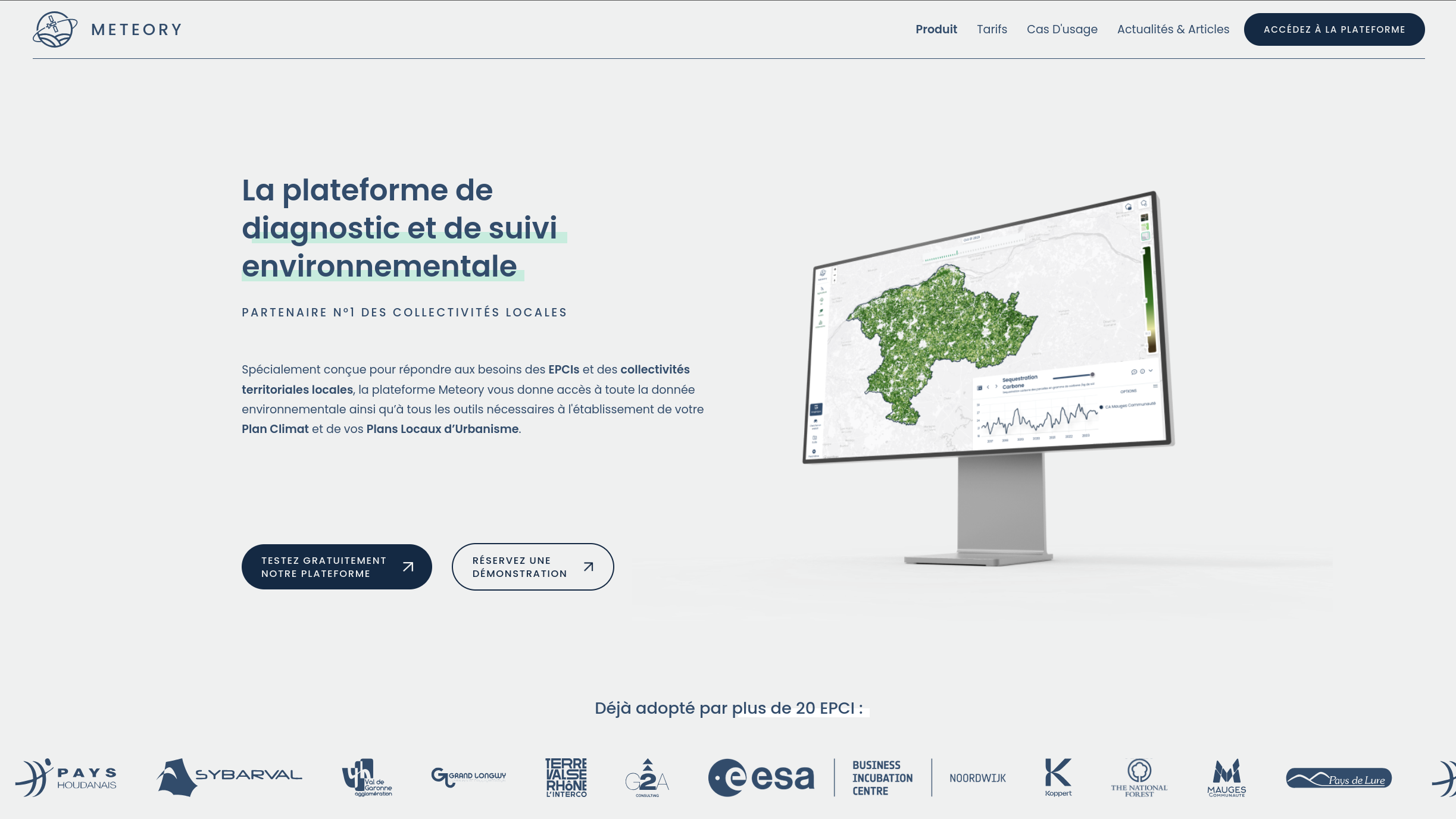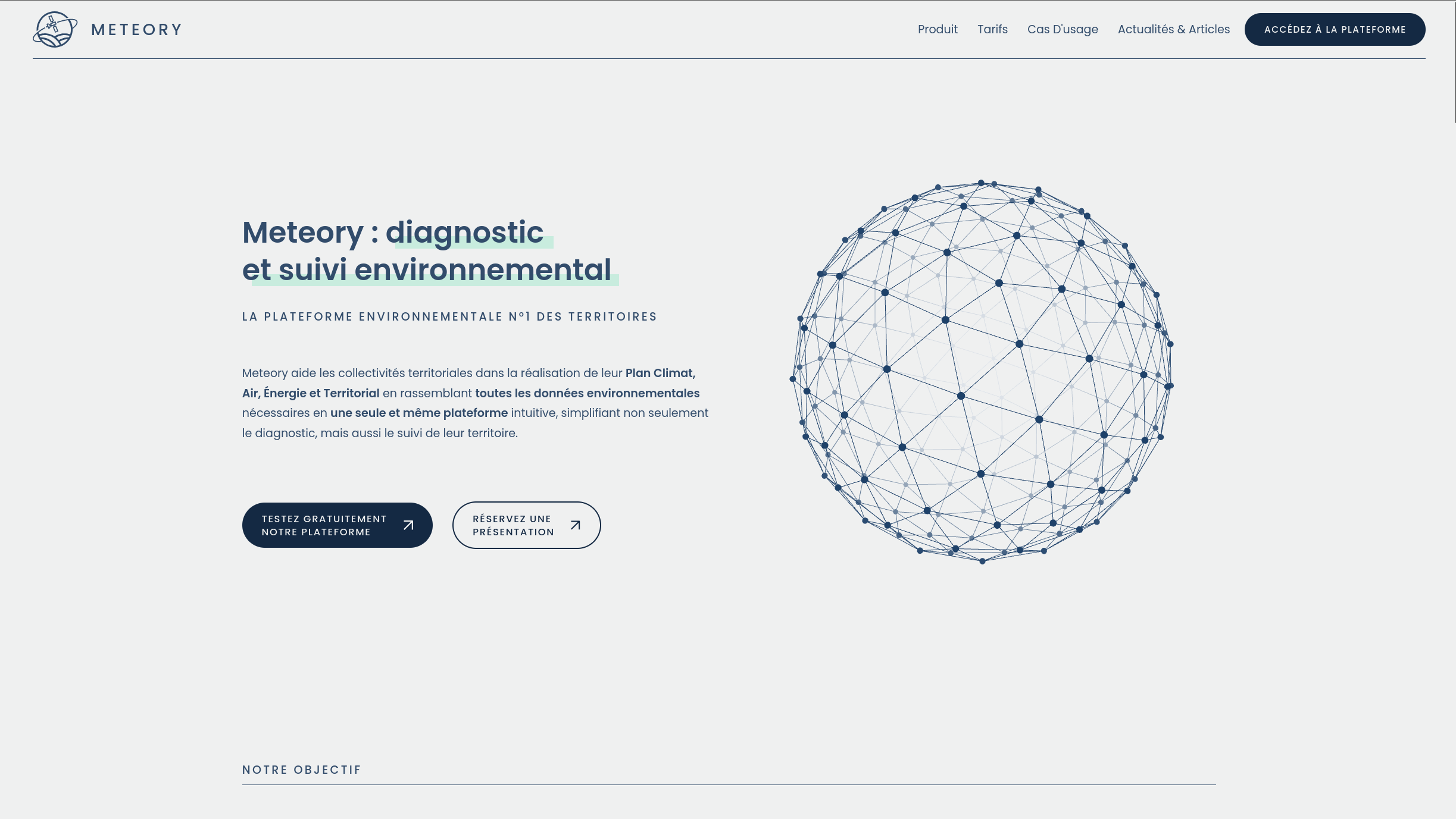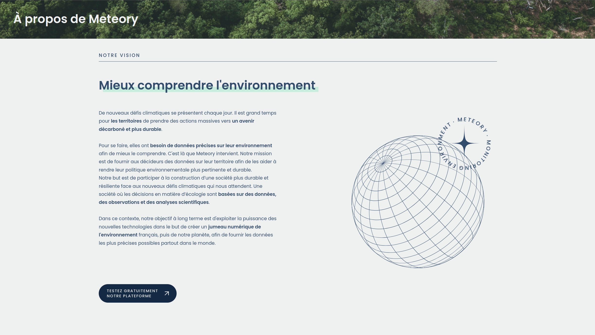 Site vitrine de Meteory présentant la plateforme environnementale, ainsi que les services proposés par la startup.